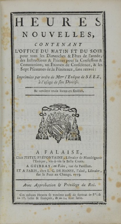 Mit dem königlichen Wappen als Titelvignette. - Prachtvoller Wappeneinband für den französischen König Louis XIV, der als der Sonnenkönig bekannt wurde. - Die 6 Rückenfelder jeweils mit einem goldgeprägten "L" mit Krone. - Titel mit gelöschtem zeitgenössischem Besitzvermerk. - Exemplar aus der Bibliothek des belgischen Bibliophilen Carlo De Poortere (Ex-Libris auf Innendeckel).