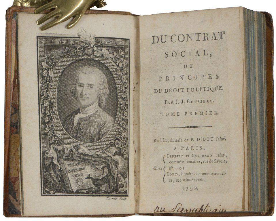 Hübsche, kleinformatige Taschenausgabe von Jean-Jacques Rousseaus Hauptwerk. Der sofort nach Erscheinen verbotetene Titel gilt heute als eines der Werke, die maßgeblich die Aufklärungsphilosophie begründet haben. "It had a profound influence on French political thought, and was perhaps more directly the cause of the Revolution than any other single factor." (PMM, Catalogue at Earls Court, 1963). - Handschriftlicher Besitzeintrag auf Vortitel und am unteren Rand des Titels, gering fleckig. Gutes Exemplar.