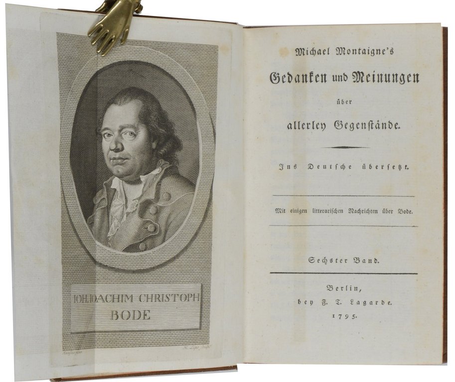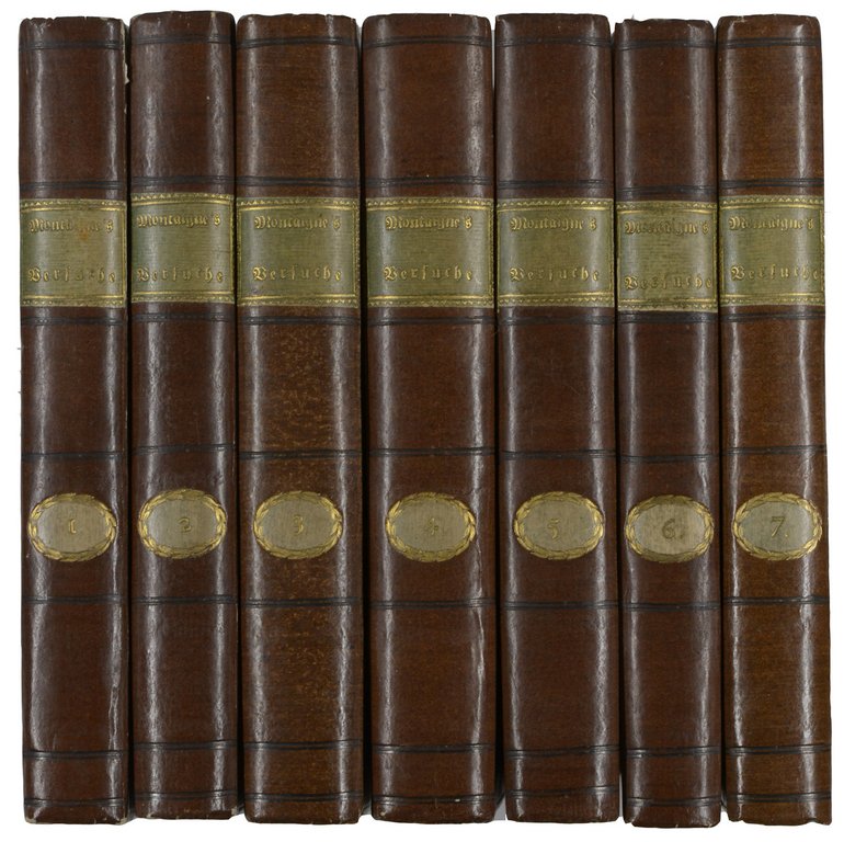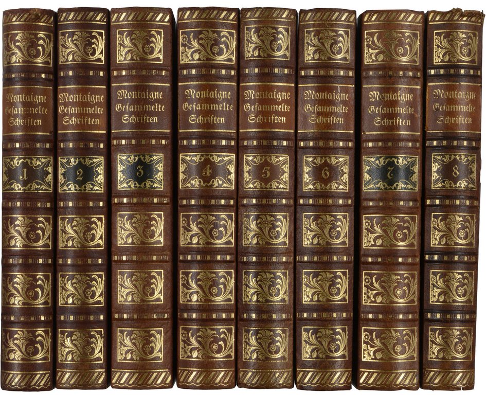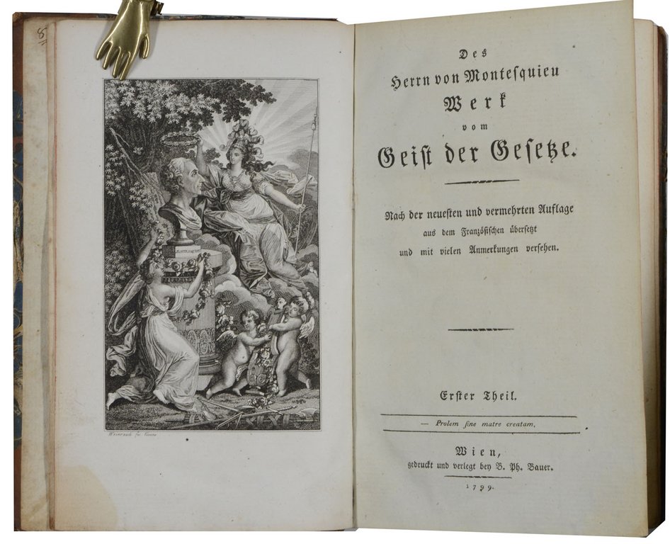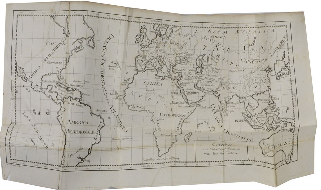 Erste deutsche Gesamtausgabe. - Fromm IV,18391. - 1-4) Geist der Gesetze; 5) Betrachtungen über die Ursachen der Größe und des Verfalls der Römer; 6-8) Kleinere Werke. - Der französische Philosoph und Staatstheoretiker Charles de Montesquieu (1689-1755) gilt als einer der bedeutendsten Vordenker der französischen Revolution. Die von ihm entwickelten geschichtsphilosophischen und staatstheoretischen Ansätze haben teilweise bis heute Bedeutung. Hervorzuheben sind vor allem seine in den "Geist und Gesetzte" entwickelten Ideen der Gewaltenteilung (Legislative, Exekutive und Judikative), die zur französischen Revolution führten und noch heute die Grundlage der demokratischen Staaten darstellen. - Seine "Persischen Briefe" sind ein erstes Beispiel dafür, dass alle Kulturen als gleichwertig angesehen werden können. - Die letzten Blatt in Band 8 mit Wurmgang, dadurch etwas Buchstabenverlust, teils leicht stockfleckig, eine der Karten mit alt hinterlegtem Einriss, Besitzeintrag auf fliegenden Vorsätzen, Ex-Libris (aus der Bücher-Sammlung des Grafen Casimirs Schenk von Kastell zu Waal) auf Innendeckeln.