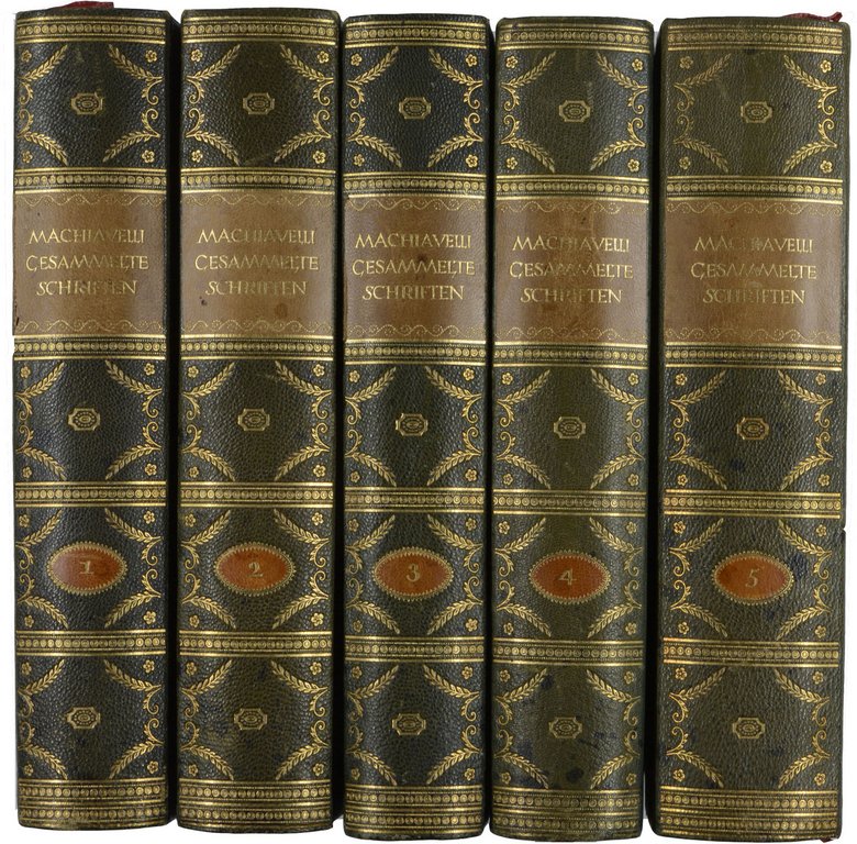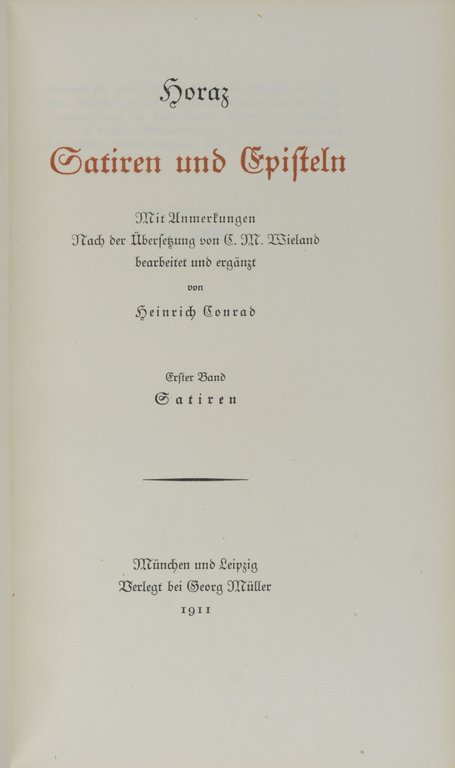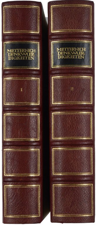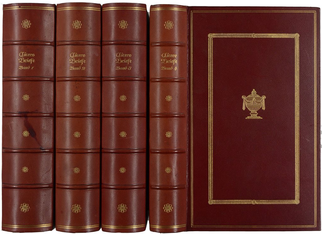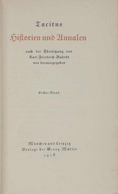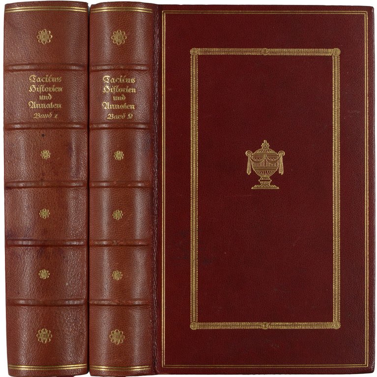 TACITUS, (Publius Cornelius). Historien und Annalen nach der Übersetzung von Karl Friedrich Bahrdt neu herausgegeben. 2 Bände. München Georg Müller, 1918. 8°. XI, 544 S., 1 nn. Bl.; 2 nn. Bl., 393 S., 1 nn. Bl. Originalleder mit Rücken- und Deckelvergoldung, goldgeprägtem Rückentitel und Kopfgoldschnitt, (gering beschabt, Rücken leicht verblichen und leicht fleckig). (Klassiker des Altertums, 1. Reihe, Band 21 und 22). € 300,00