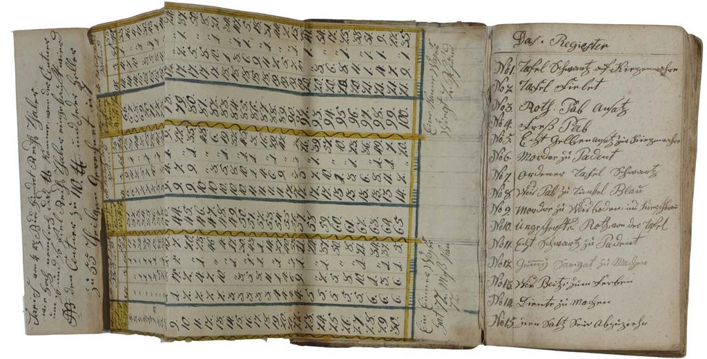 Interessantes Färberbuch aus dem süddeutschen Raum mit 120 Rezepten für Farbbäder, Anleitungen zur Fixierung der Farben, Mischungen etc. - Mit mehr als 150 eingeklebten Stoffmustern. - Fingerfleckig und etwas gelockert, teils leicht gebräunt.