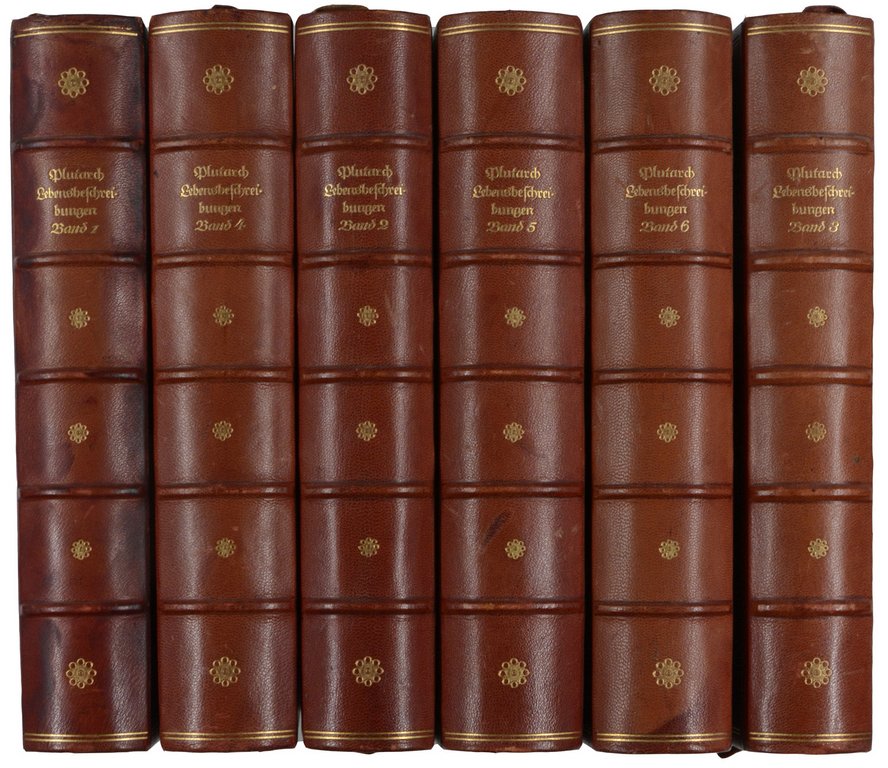 PLUTARCH. Lebensbeschreibungen. Mit Anmerkungen nach der Übersetzung von Kaltwasser bearbeitet von Hanns Floerke. 6 Bände. München, Leipzig, Georg Müller, 1913. 8°. Originalleder mit Rücken- und Deckelvergoldung, Innenkantenfileten, goldgeprägtem Rückentitel und Kopfgoldschnitt, (gering beschabt, Band 1 etwas fleckig). (Klassiker des Altertums, Zweite Reihe, Band 1-6). € 780,00