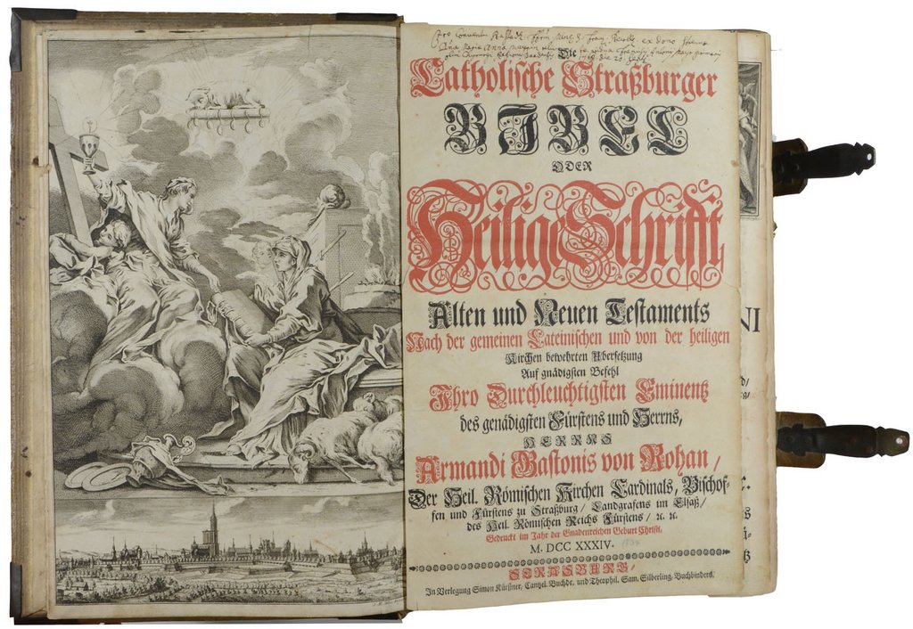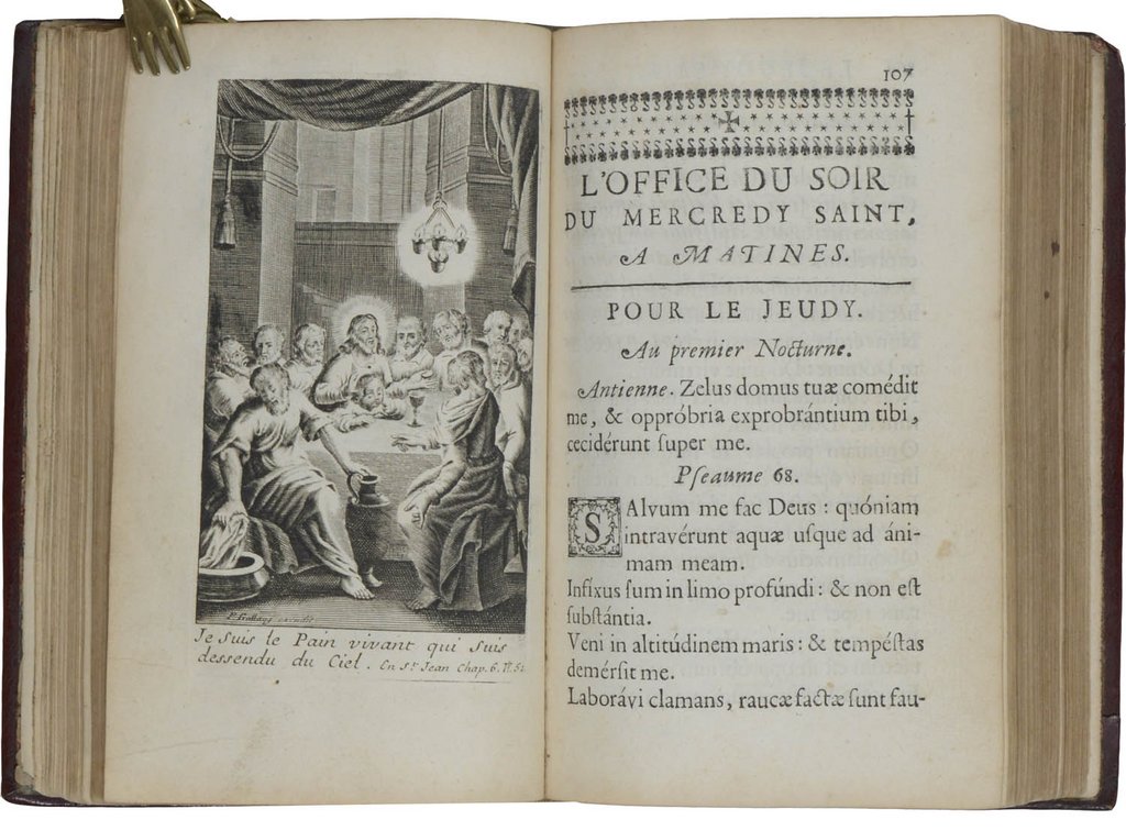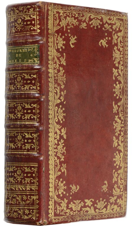 WAPPENEINBAND - LOUIS XIV - L'Office de la Semaine Sainte; corrigé par le Commandement du Roy. Nouvelle édition. Paris, Fr. Grange, o.J. (um 1710) Gross-8°. 3 nn. Bl., 515 S., mit 4 ganzseitigen Kupfertafeln. Dunkelrotes Maroquin der Zeit mit reicher Rückenvergoldung, Vorder- und Rückendeckel jeweils mit dem Wappensupralibros Ludwigs XIV., dreifache Deckelfileten und Eckfleurons, Stehkantenvergoldung, Goldschnitt, (etwas beschabt und bestoßen, leicht aufgebogen, vorderes Gelenk leicht eingerissen). € 980,00