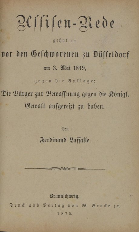 5) Assisen-Rede gehalten vor den Geschworenen zu Düsseldorf am 3. Mai 1849, gegen die Anklage: Die Bürger zur Bewaffnung gegen die Königl. Gewalt aufgereizt zu haben. Braunschweig, Bracke, 1875. 80 S.