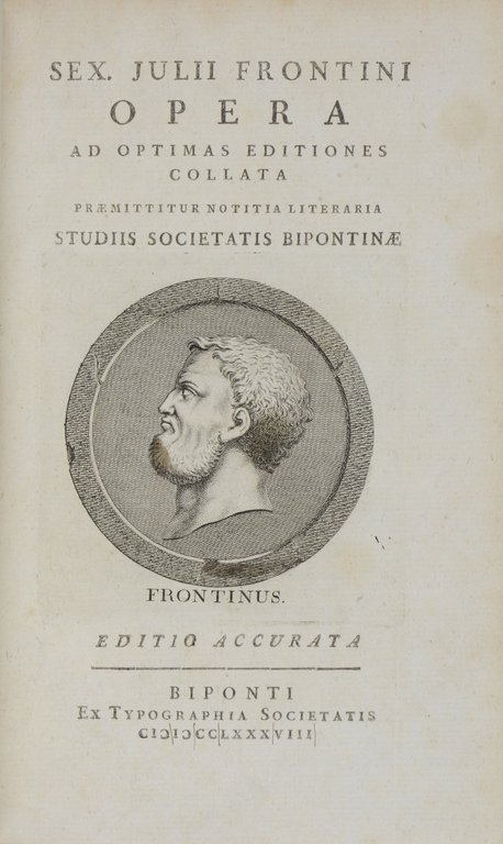 ALTPHILOLOGIE - FRONTINUS, Sex(tus) Julius. Opera. Ad optima editiones collata. Editio accurata. Zweibrücken, Typographia Societatis, 1788. 8°. LXIII, 236 S., mit gestochener Titelvignette. Halbleder der Zeit mit Rückenvergoldung und Rückenschild, (gering beschabt). € 110,00