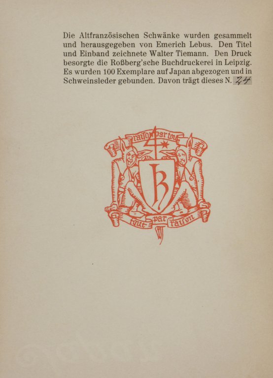 Eins von 100 nummerierten Exemplaren der Vorzugsausgabe auf Van Geldern und in Ganzleder (Nr. 48). - Hayn/Gotendorf IX, 489; Fromm V, 21733. - Ausgewählt und übertragen von Heinrich Conrad. Mit einer Einleitung von Ulrich Rauscher. - Eine Sammlung erotischer Novellen, die erstmals 1780 erschienen, und mit der der Autor Rétif de la Bretonne (1734-1806) schlagartig bekannt wurde. - Schöne dekorative Ausgabe.