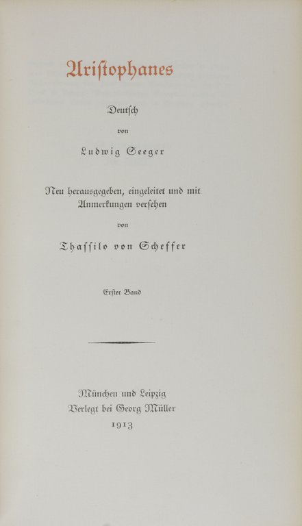 ARISTOPHANES. Komödien. Deutsch von Ludwig Seeger. Neu herausgegeben, eingeleitet und mit Anmerkungenversehen von Thassilo von Scheffer. 2 Bände. München, Leipzig, Georg Müller, 1913. 8°. 4 nn. Bl., 429 S.; 4 nn. Bl., 509 S. Originalleder mit Rücken- und Deckelvergoldung, goldgeprägtem Rückentitel und Kopfgoldschnitt, (minimal beschabt). (Klassiker des Altertums, 2. Reihe, Bd. 7/8). € 320,00