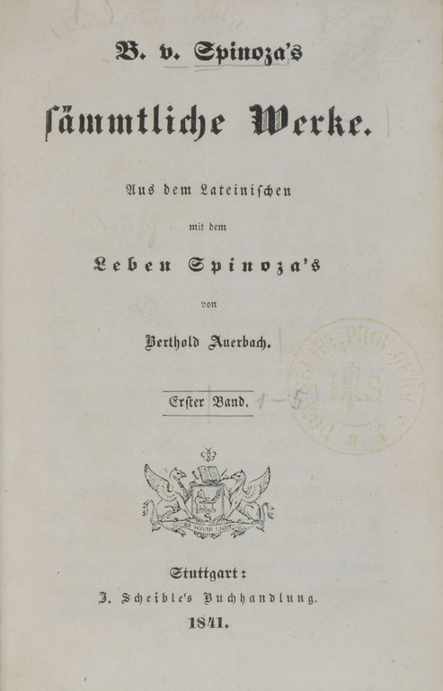 Erste Ausgabe der Übersetzung der Werke des berühmten jüdischen Philosophen Baruch de Spinoza, mit dem sich Berthold Auerbach bereits von frühester Jugend an beschäftigte. - Goedeke NF 497, 199. - Er war fasziniert von der Lebensgeschichte dieses großen Denkers und Vorkämpfers für die Befreiung von religiöser Orthodoxie, der zahlreiche deutsche Philosophen beeinflusste und heute als ein Vorläufer der modernen Philosophie gilt. - Enthält neben einer umfassenden Biographie die Prinzipien der Cartesischen Philosophie, theologisch-politischer Traktat, die Ethik, Abhandlung über Politik, Briefwechsel, u.a. - Ohne das gestochene Porträt. - Etwas stockfleckig, verblasster Stempel auf Titeln.