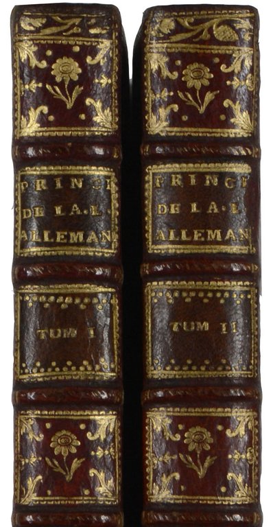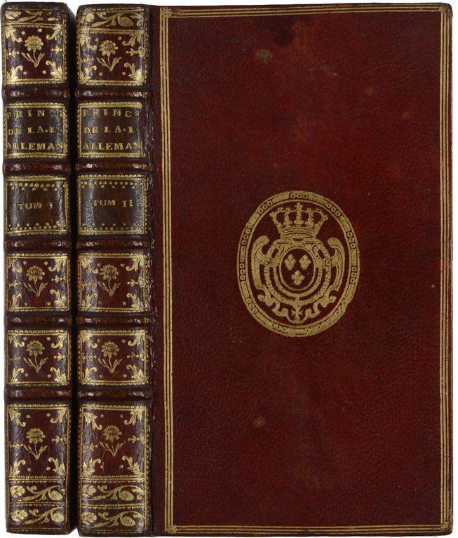 WAPPENEINBÄNDE - JUNKER, (Georg-Adam). Nouveaux principes de la langue Allemande, pour l'usage de l'École Militaire. Nouvelle édition. 2 Bände. Paris, Musier, 1762. 8°. 2 nn. Bl., LXIV, 278 S.; 1 nn. Bl., 408 S. Dunkelrotes Maroquin um 1765 mit reicher floraler Rückenvergoldung und Rückentitel, Vorder- und Rückendeckel jeweils mit dem Wappensupralibros Ludwigs XV., doppelte Deckelfileten, Steh- und Innenkantenvergoldung, Goldschnitt, (leicht beschabt und leicht fleckig). € 1.200,00