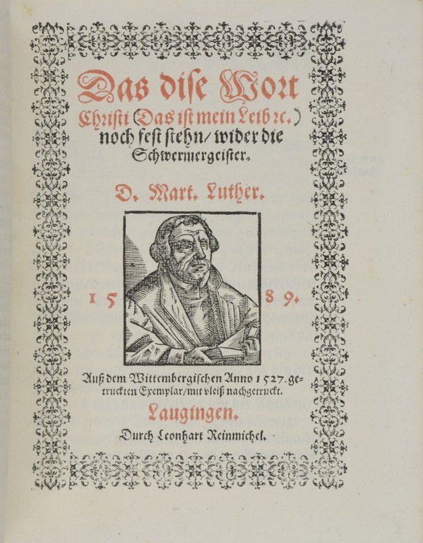 Band 2 der so genannten "Jenaer" Gesamtausgabe der Werke Martin Luthers. - VD 16, L 3377. - Der Titelholzschnitt mit einem Porträt von Luther und dem Kurfürsten Johann Friedrich von Sachsen neben einem Kruzifix kniend. Der ganzseitige Textholzschnitt zeigt Brustbilder der drei sächsischen Herzöge Johann Friedrich der Mittlere, Johann Wilhelm und Johann Friedrich der Jüngere, jeweils mit einer Darstellung des Wappens. - Die beiden Textholzschnitte zeigen den "Bapstesel" und das "Münchkalb". - Durchgehend etwas gebräunt und an den Rändern stockfleckig. Titel mit gelöschtem zeitgenössischen Besitzeintrag, dadurch kleine Papierlöcher. Mit einigen zeitgenössischen Anmerkungen und Unterstreichungen. - Besitzeintrag (Carl Heinrich Hofmann) auf fliegendem Vorsatz und Besitzerstempel (Manfred K. Walther Nr. 184) auf Innendeckel. - Gutes Exemplar in einem blindgeprägten Einband der Zeit.