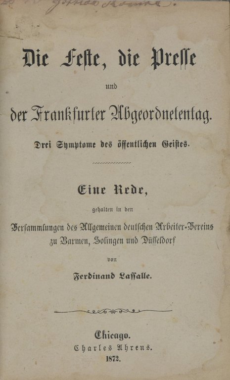 4) Die Feste, die Presse und der Frankfurter Abgeordnetentag. Drei Symptome des öffentlichen Geistes. Eine Rede, gehalten in den Versammlungen des Allgemeinen deutschen Arbeiter-Vereins zu Barmen, Solingen und Düsseldorf. Chicago, Charles Ahrens, 1872. 40 S.