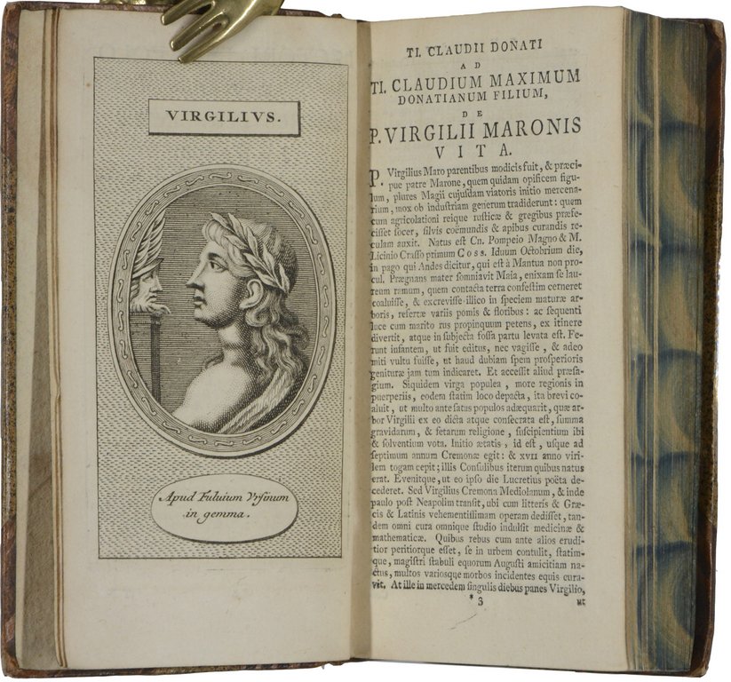 VERGILIUS MARO, P. (Opera) ex editione Nic. Heinsii & P. Burmanni. Amsterdam, Wetstenium, 1744. 12°. Gestochener Titel, 16 nn. Bl. (inkl. Titel), 328 S., mit einem gestochenen Porträt. Halbleder der Zeit mit Rückenvergoldung und Rückenschild, (gering beschabt). € 150,00