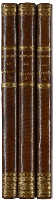 ZSCHOKKE, Heinrich (Hrsg.). Prometheus. Für Licht und Recht. Zeitschrift in zwanglosen Heften. 3 Teile in 3 Bänden (=alles Erschienene). Aarau, Sauerländer, 1832-1833. Gross-8°. VIII, 294 S., 1 nn. Bl.; 328; 299 S. Halbleder der Zeit mit Rückentitel und Rückenvergoldung, (gering beschabt). € 1.400,00