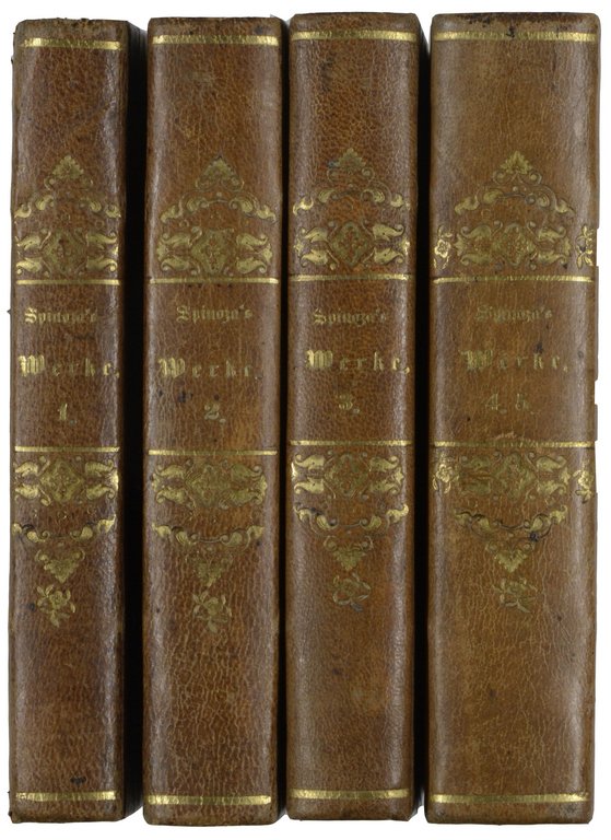 - - SPINOZA, B(aruch) de. Sämmtliche Werke. Aus dem Lateinischen mit dem Leben Spinoza's von Berthold Auerbach. 5 Bände in 4 Bänden. Stuttgart, Cotta, 1841. Klein-8°. Halbleder der Zeit mit Rückenvergoldung und Rückentitel, (gering beschabt, Ecken leicht bestoßen). € 180,00