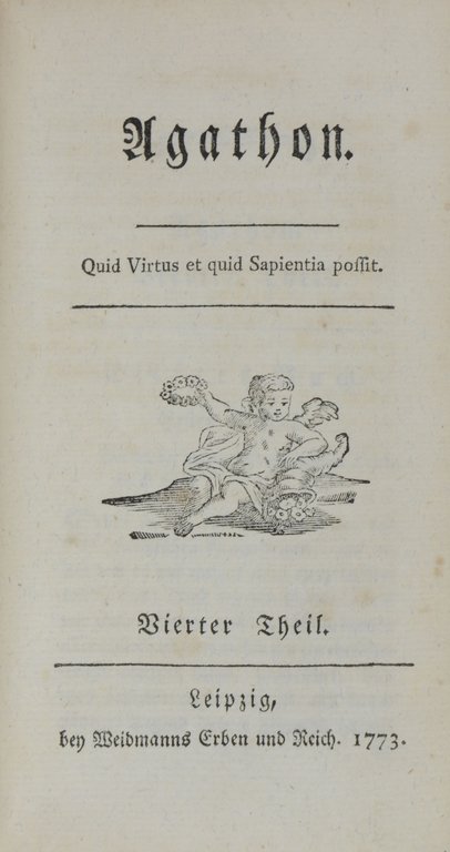 (WIELAND, Christoph Martin). Agathon. Quid Virtus et quid Sapientia possit. 4 Teile in 2 Bänden. Leipzig, Weidmann Erben und Reich, 1773. Klein-8°. Mit 4 gestochenen Frontispizen und 4 gestochenen Titelvignetten. Schlichte Pappbände der Zeit mit Rückenschildern. (etwas beschabt, Ecken leicht gestaucht). € 480,00