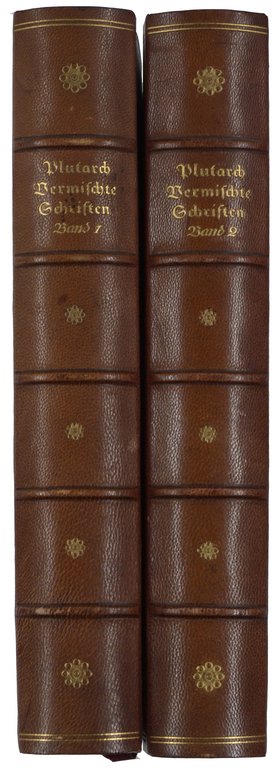 PLUTARCH. Vermischte Schriften. Mit Anmerkungen nach der Übersetzung von Kaltwasser vollständig herausgegeben. Bände 1 und 2 (von 3 Bänden). München, Leipzig, Georg Müller, 1911. 8°. XII, 374 S.; 3 nn. Bl., 358 S. Originalleder mit Rücken- und Deckelvergoldung, Innenkantenfileten, goldgeprägtem Rückentitel und Kopfgoldschnitt, (Deckel von Band 1 mit leichtem Berieb, Rücken etwas verblasst). (Klassiker des Altertums, Erste Reihe, Band 1 und 2). € 180,00
