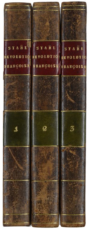 STAËL-(HOLSTEIN, Anna Louise Germaine de). Considérations sur les principaux événemens de la Révolution Françoise. Ouvrage posthume publié par le Duc de Broglie et le Baron de Staël. 3 Bände. Paris, Delaunay und Bossange et Masson, 1818. 8°. Halbleder der Zeit mit Rückenschildern und leichter Rückenvergoldung, (leicht beschabt, ein Rückenschild mit kleiner Fehlstelle). € 480,00