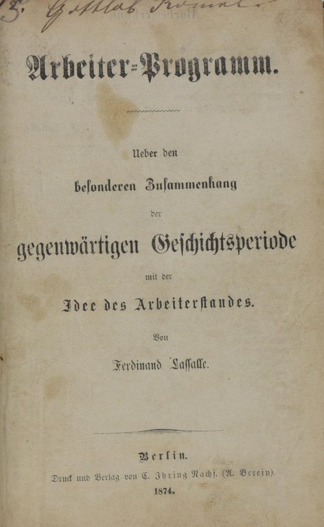 3) Arbeiter-Programm. Ueber den besonderen Zusammenhang der gegenwärtigen Geschichtsperiode mit der Idee des Arbeiterstandes. Berlin, 1874. 40 S.