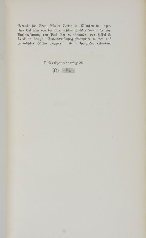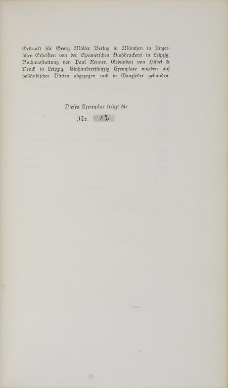 Eins von nur 150 nummerierten Exemplaren (Nr. 12) der Vorzugsausgabe auf holländischem Bütten und in Ganzleder. - Buchausstattung von Paul Renner. Einbände bei Hübel & Denck in Leipzig. - Besitzerschildchen (Wolfram Stauffer Palmsonntag 1952) auf Innendeckeln. Papierbedingt leicht gebräunt.