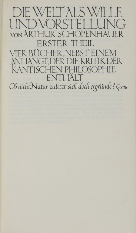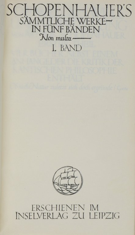 - - SCHOPENHAUER, Arthur. Die Welt als Wille und Vorstellung. 2 Bände. Leipzig, Insel-Verlag, (1905). 8°. 1462 S., 1 nn. Bl. Originalleder mit goldgeprägtem Rücken- und Deckeltitel, (Rücken etwas verblasst). € 120,00