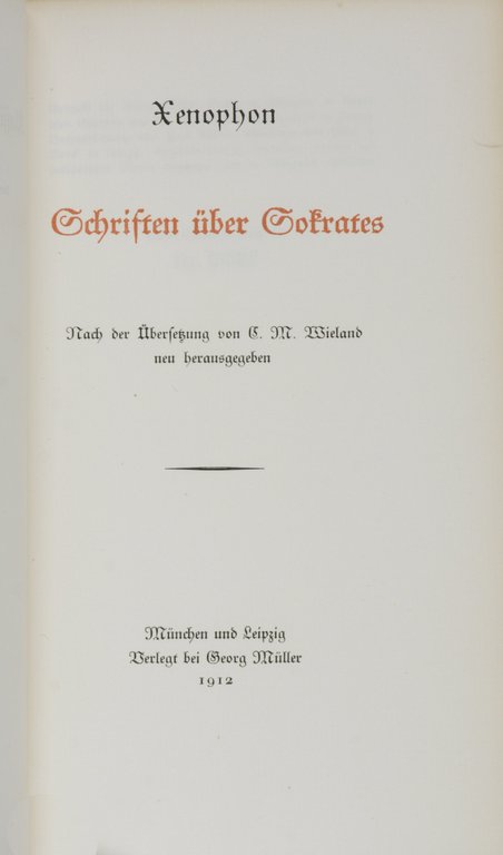XENOPHON. Schriften über Sokrates. Nach der Übersetzung von C.M.Wieland neu herausgegeben. München, Leipzig, Georg Müller, 1912. 8°. 4 nn. Bl., 250 S. Originalleder mit Rücken- und Deckelvergoldung, Innenkantenfileten, goldgeprägtem Rückentitel und Kopfgoldschnitt, (minimal beschabt, obere Ecken minimal gestaucht). (Klassiker des Altertums, Erste Reihe, Band 16). € 140,00