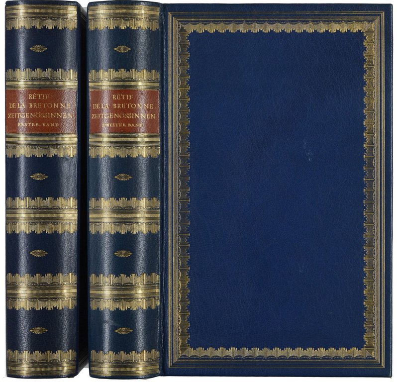 RÉTIF DE LA BRETONNE, (Nicolas Edme). Zeitgenössinnen. Abenteuer historischer Frauen. 2 Bände. München, Georg Müller, (1914). 8°. XVII, 316 S.; 2 nn. Bl., 292 S., 1 nn. Bl., mit 18 Tafeln. Blauer Originalleder mit reicher Rücken- und Deckelvergoldung, Rückenschildern, Kopfgoldschnitt, (Ecken minimal angestoßen). € 380,00