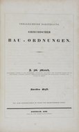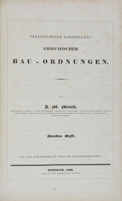ARCHITEKTUR - (NORMAND, Charles und) J.M. MAUCH. Vergleichende Darstellung der architectonischen Ordnungen der Griechen und Römer und der neueren Baumeister (und) Supplement: Vergleichende Darstellung griechischer Bau-Ordnungen. 1 Band und 4 Hefte in 1 Band. Potsdam, Riegel, 1830-1845. Folio. Mit gestochenem Titel, 2 kolorierten Frontispizen (1 Kupferstich und 1 Lithographie) und 99 gestochenen Tafeln. Halbleder der zweiten Hälfte des 19. Jahrhunderts mit Rückentitel, (etwas berieben, Ecken gestaucht). € 280,00