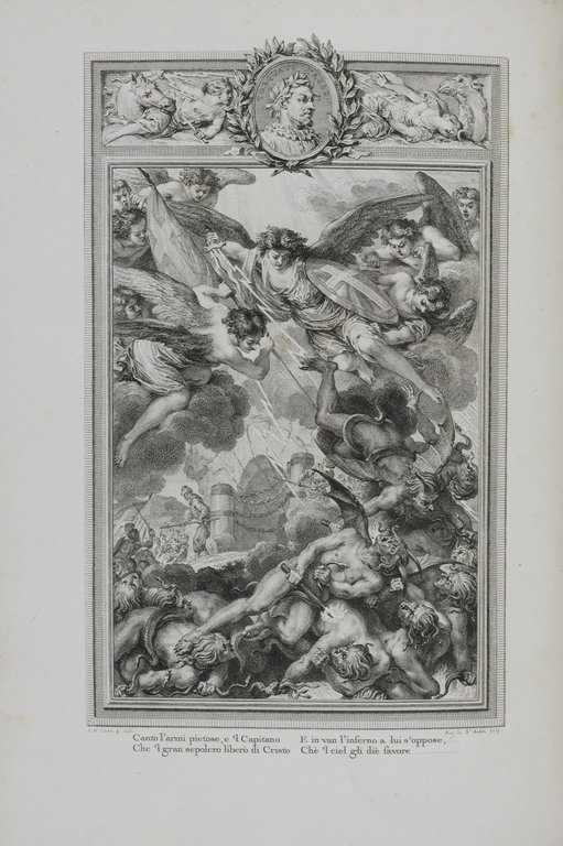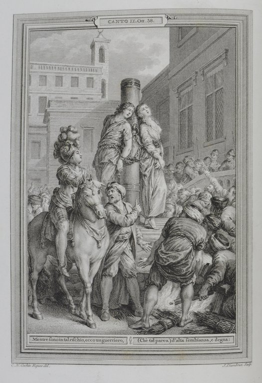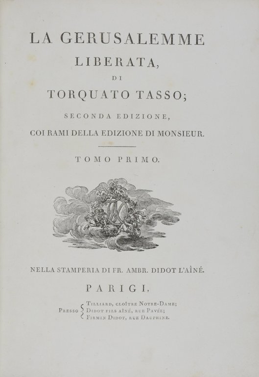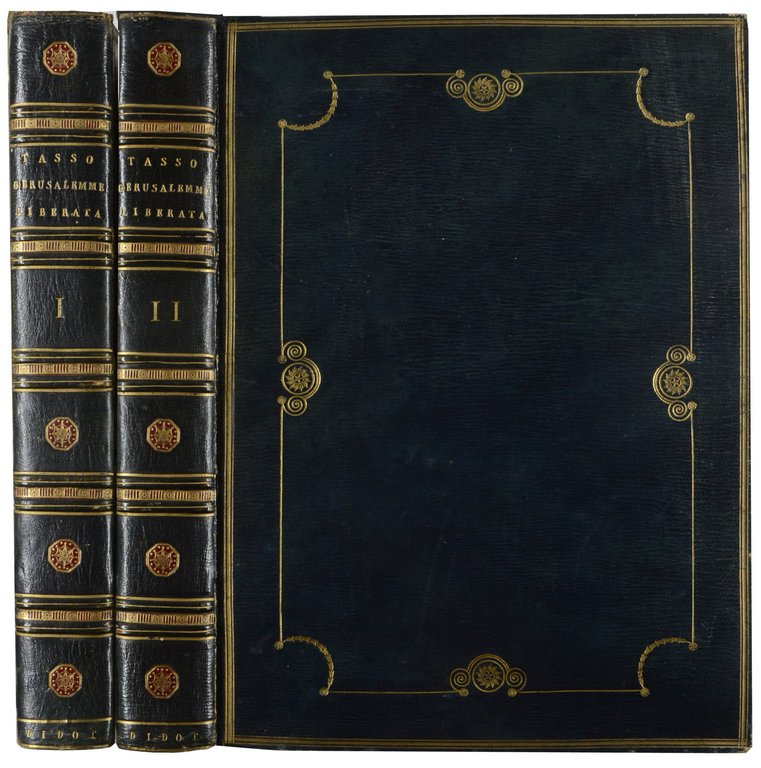 TASSO, Torquato. La Gerusalemme liberata. Seconda edizione. 2 Bände. Paris, F.Didot, (1785-1786). 4°. 2 nn. Bl., 331 S.; 2 nn. Bl., 334 S., mit gestochenem Frontispiz und 40 Kupfertafeln nach Cochin. Dunkelblaues genarbtes Maroquin der Zeit mit Rücken- und Deckelvergoldung, sowie Steh- und Innenkantenvergoldung, Rücken mit roten Intarsien, Goldschnitt, (etwas beschabt). € 2.000,00