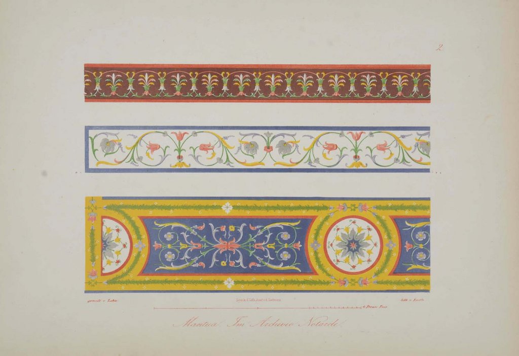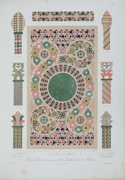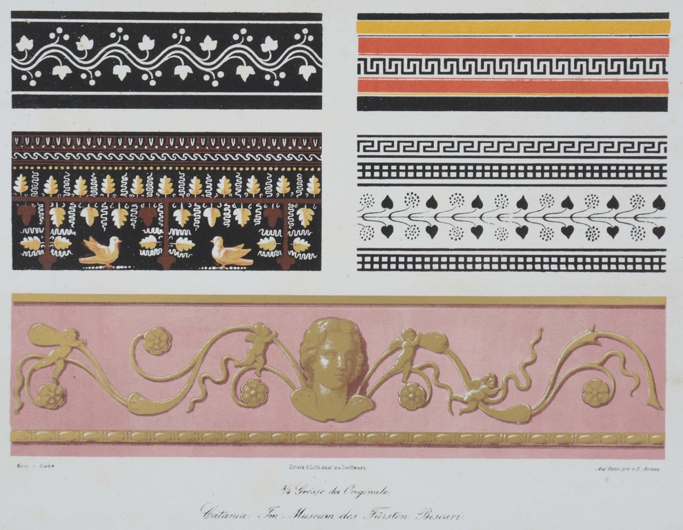Ornamentale Vorlagenwerke des 19. Jahrhunderts 122; vgl. Thieme-Becker 36, 385; ADB 64, 669. - Die erste Ausgabe dieser schönen, dekorativen Wiedergaben von aegyptischen, römischen und altgriechischen Malereien u. a. aus Pompeji und Herculanum, Mosaiken der normannischen Kirchen in Sizilien aber auch Wand- und Deckenmalereien des 16. Jahrhunderts in Mantua und Rom entstand in 20 Lieferungen in der Zeit von 1832-1848. - Der deutsche Architekt, Maler und Lithograph Wilhelm Zahn (1800-1871) hat mit seinen Veröffentlichungen zu den antiken Wandmalereien einen entscheidenden Einfluss auf die Entwicklung des Neoklassizismus gehabt. - "Gelegentlich verwerthete er seine Kenntniß der antiken Baukunst und Decoration zu Entwürfen für Villen und Privathäuser, so für das von König Ludwig von Baiern in Aschaffenburg am Mainufer nach dem Muster des Hauses des Castor und Pollux in Pompeji ausgeführte „pompejanische Haus“. Seine gezeichneten Aufnahmen antiker Wandgemälde befleißigen sich einer objectiven Treue, ohne jedoch den idealisirenden Zug der zeitgenössischen Kunst gänzlich zu meiden. Seine Technik des Farbensteindruckes fand bald Nachahmer und verdient in der Geschichte der farbigen Reproductionsverfahren Beachtung." (ADB 64, 669/670). - Etwas stockfleckig, am unteren Rand teils wasserfleckig, die letzten Blatt etwas stärker betroffen, diese auch leicht gelockert.