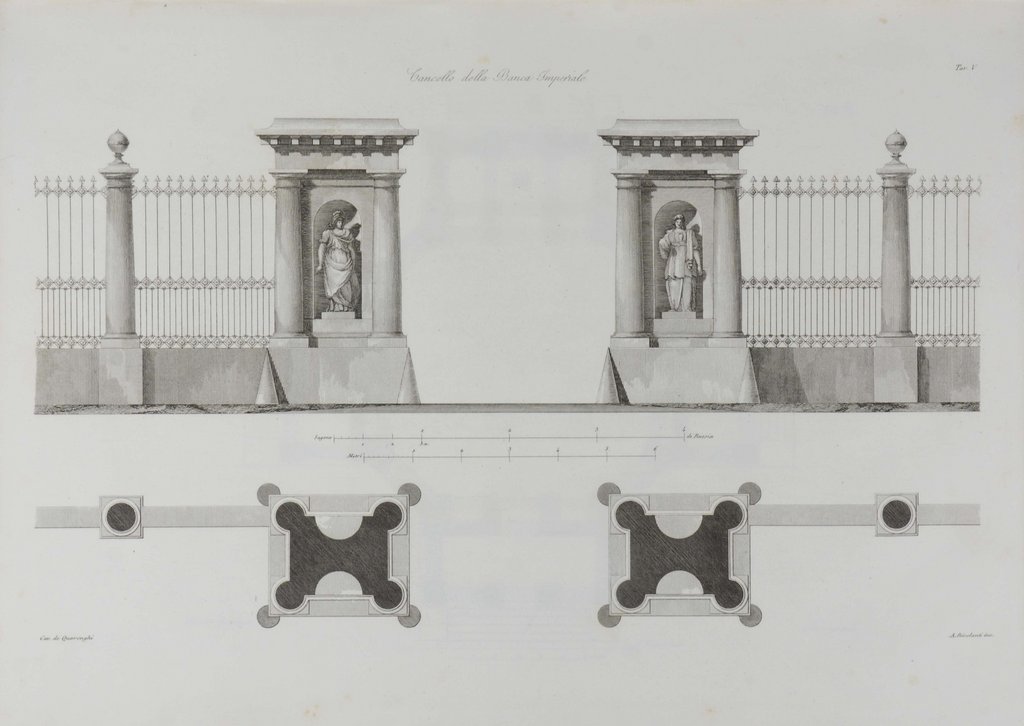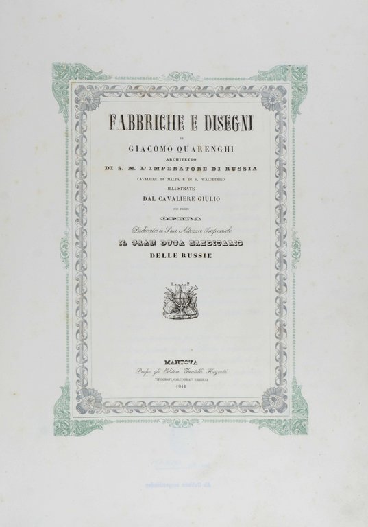 Erweiterte Ausgabe. - Nur Band 2 der gesuchten, um wesentlich mehr Tafeln erweiterten Auflage. Wichtiges Werk über die klassizistischen Bauten des italienischen Hofarchitekten Katharinas der Großen, Giacomo Quarenghi (1744-1817). - Das Werk beschreibt und illustriert Bauprojekte in und um St. Petersburg, darunter Paläste, Regierungsgebäude, Kirchen, Theater und Banken. Zu den wichtigsten Bauten Quarenghis gehört z.B. der Alexanderpalast in St. Petersburg. - Widmungsblatt mit einer in Rot und Blau gedruckten Umrandung, Titel in Grün und Schwarz. - Gering stockfleckig.
