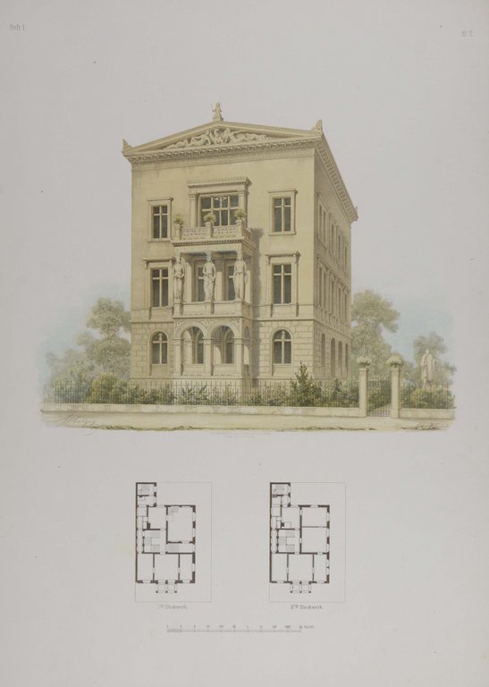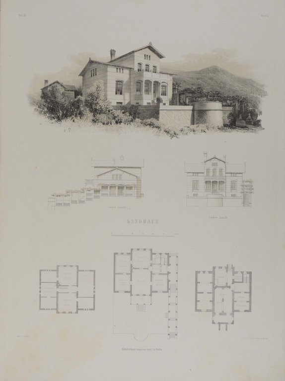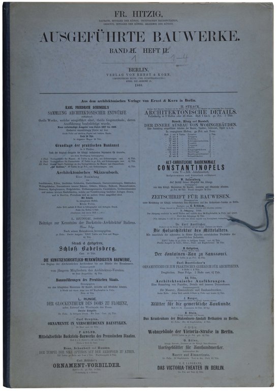 Der komplette Band 1, von nur 2 erschienenen Bänden, mit allen 4 Heften und dem Supplement. - Berlin-Bibliothek 491. - Friedrich Hitzig (1811-1881) gehörte der Architektengeneration nach Friedrich Schinkel an, war jedoch maßgeblich von ihm geprägt. Die im vorliegenden Band abgebildeten Wohnhäuser und Bauprojekte wurden alle verwirklicht und tatsächlich gebaut. Darunter finden sich Gebäude in Berlin, Danzig, Thüringen, Mecklenburg, usw. Sie stellt somit eine hervorragende Dokumentation des klassizistischen Bauens in Deutschland dar. Die meisten der Gebäude wurden jedoch im Zweiten Weltkrieg zerstört. Das Hauptgebäude der TU Berlin zählt zu den wenigen heute noch existierenden Monumentalbauten, an denen Friedrich Hitzig beteiligt war. - "Hitzigs größter Verdienst lag jedoch im Wohnbau... Diese Häuser mit ihren Balkonen, Erkern, Altanen, Giebeln und gelegentlich auch flachen Türmen bestimmten weitgehend das Gesicht des alten Berliner Tiergartenviertels." (NDB 9, 274). - Die interessanten Tafeln zeigen Wohngebäude, und deren Details, Grundrisse, Wanddekorationen und Schmuckornamente. - Lose , die Vortitel etwas knittrig, Tafeln teils angestaubt und mit kleineren Randläsuren.