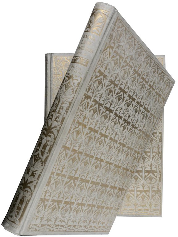 HAMILTON - FRANKAU, Julia. The Story of Emma, Lady Hamilton. 2 Bände. London, Macmillan and Co., 1911. Folio. X, 106 S., 1 nn. Bl.; VIII, 113 S., 1 nn. Bl., mit 38 (davon 30 farbigen) Tafeln und 37 einfarbig gedruckte Illustrationen im Text. Originalpergament mit reicher Deckel- und Rückenvergoldung und Rückentitel, Kopfgoldschnitt, (leicht fleckig und etwas angestaubt und beschabt). € 580,00