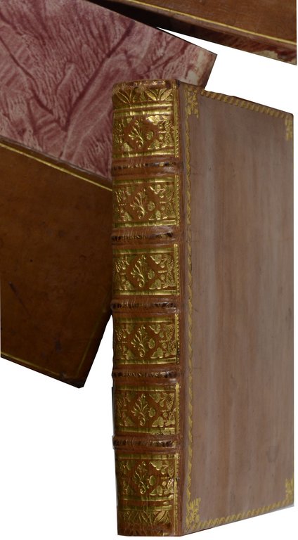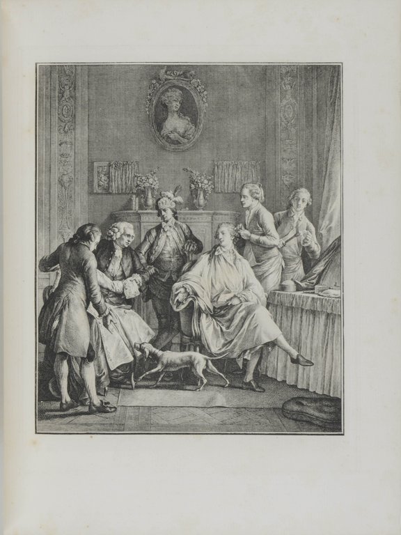 Sander 1891; Cohen-R. 977. - Erstmals 1784, auf Veranlassung des Comte de Provence (dem späteren Ludwig XVIII.), gedruckte prachtvolle Ausgabe. Beide Ausgaben erschienen nur in 200 Exemplaren. - Die detailreichen Illustrationen, gestochen von verschiedenen Künstlern der Zeit gelten als das Alterswerk von Cochin. - Unserem Exemplar sind 32 der Tafeln nochmals lose in einem früheren Zustand ohne Text beigelegt. - Etwas stockfleckig, Band 1 teilweise mit größerem Wasserfleck am unteren Rand, nur wenig in den Text hineinragend. Fliegende Vorsätze etwas fleckig, vermutlich ein alt gelöschter Besitzvermerk. - Dekorativ gebundenes breitrandiges Exemplar.