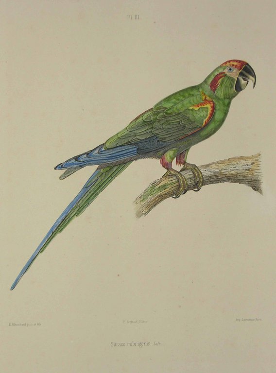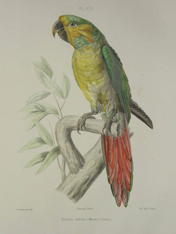Erste und einzige Ausgabe, sehr selten. - Nissen IVB 887; Anker 479; Sitwell 143; Graesse Suppl. 472. - Prachtvolles, großformatiges Papageienwerk. - Das Werk sollte ursprünglich in 30 Lieferungen erscheinen, jedoch wurde die Herausgabe nach Lieferung 12 eingestellt. Die letzte Tafel (laut Erklärung Nr. 48) ist mit der Nummer 79 versehen (jedoch so richtig). Es bildet den Band 4 oder Ergänzungsband der "Histoire naturelle des Perroquets" deren ersten Bände bereits 1801-1805 von Levaillant und der dritte Band 1837-1838 von Saint-Hillaire herausgegeben wurden. - Die ersten 15 Tafeln wurden von Blanchard gezeichnet und lithographiert, die restlichen Tafeln von Daverne. - Teils leicht stockfleckig, sehr schönes Exemplar in leuchtendem Kolorit.