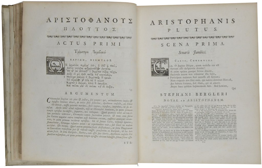 ARISTOPHANES. Comoediae undecim, graecae et latine, graece & latine, ad fidem optimorum codicum mss. emendatae cum nova octo comoediarum interpretatione Latina, & notis ad singulas ineditis Stephani Bergleri nec non Caroli Andreae Dukeri ad quatuor priores. 2 Teile in einem Band. Leiden. S- und J. Luchtmans, 1760. 4°. 3 nn. Bl., 34, 567 S.; 1 nn. Bl., S. 569-1259, mit 2 wiederholten gestochenen Titelvignetten. Pergament der Zeit mit goldgeprägten Deckelfileten, Den Haager Supralibros auf beiden Deckeln (Hagae Comitis) und Rückenvergoldung, (leicht fleckig, etwas aufgebogen). € 650,00