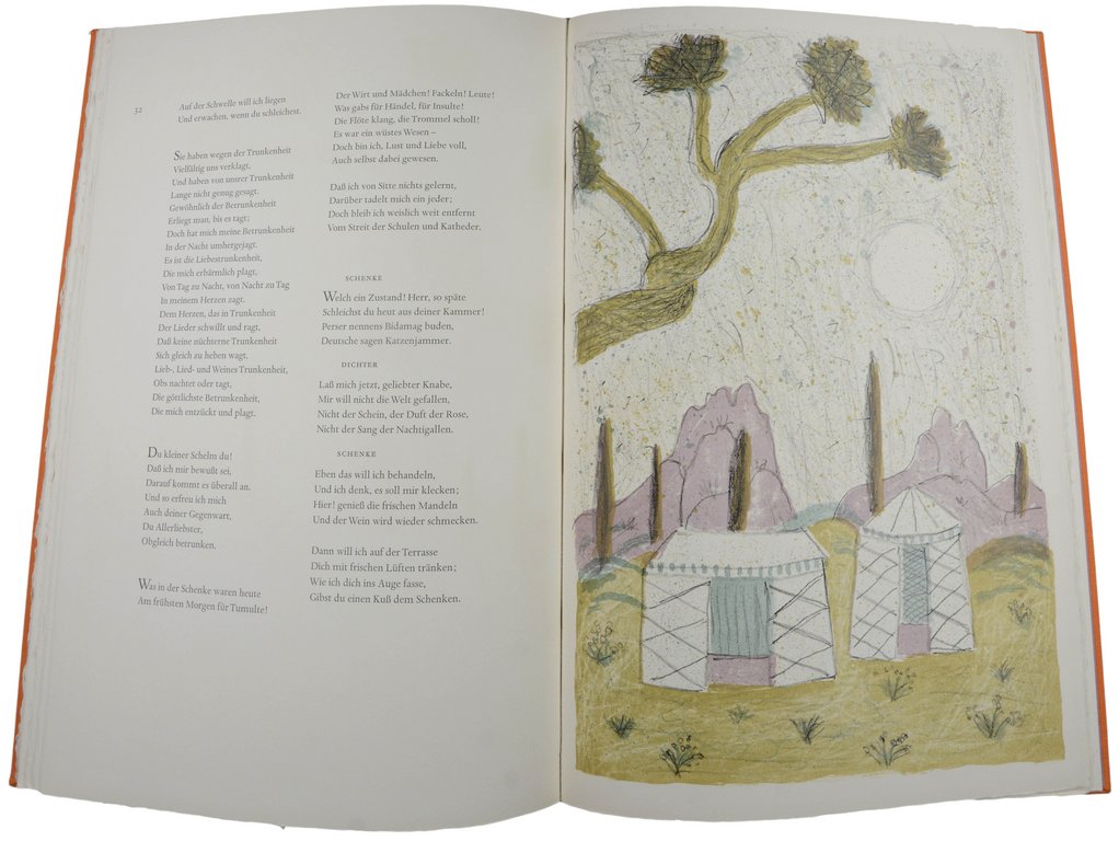 PEIFFER-WATENPHUL - GOETHE (Johann Wolfgang von). Buch Suleika.Gefolgt vom Schenkenbuch. Dem westöstlichen Divan entliehen. Frankfurt, Ars Librorum Gotthard de Beauclair, 1966. Folio. 37 S., 1 nn. Bl., mit 14 (5 ganzseitigen) farbigen Originallithographien von Max Peiffer-Watenphul. Originalhalbpergament mit montierter Originallithographie auf dem Vorderdeckel und orangefarbenem Seidenbezug, Rückentitel, im Originalschuber. € 650,00