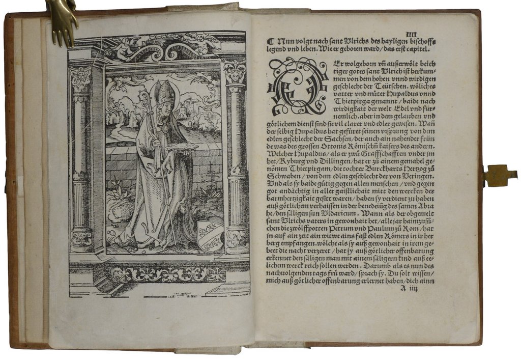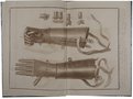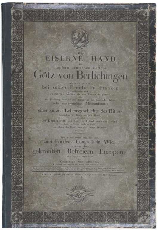 MECHEL, Christian von. Die Eiserne Hand des tapfern deutschen Ritters Götz von Berlichingen wie selbige noch bei seiner Familie in Franken aufbewahrt wird, sowohl von Aussen als von Innen dargestellt, nebst der Erklärung ihres für jene Zeiten... sehr merkwürdigen Mechanismus... Den in den Jahren 1814 und 1815 zum Friedens-Congress in Wien versammelten gekrönten Befreiern Europen's ehrerbietigst zugeeignet. Berlin, Georg Decker, 1815. Groß-Folio. Titel, 10 S., mit gestochenem Portät, 2 doppelblattgroßen Aquatintatafeln und 1 Kupferradierung. Halbleinen der Zeit mit montiertem Vorderumschlag der Originalbroschur auf dem Vorderdeckel, (etwas berieben und bestoßen). € 1.500,00
