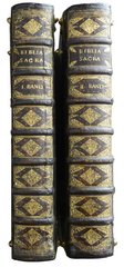 Durch den katholischen Theologen Leander van Eß (1772-1847) herausgegebene Stereotypausgabe des alten Testaments in griechischer Sprache. - In einem sehr schönen Einband der Zeit, mit einer von Fileten eingefassten goldgeprägten Deckelbordüre, Steh- und Innenkantenvergoldung und reicher Rückenvergoldung. Vor- und Nachsatz mit blauem Glanzpapier. - Minimal stockfleckig, Stempel (Biblioth. FF.Min.Conv.Marienthal) auf Titel und Besitzeinträgen auf fliegendem Vorsatz.