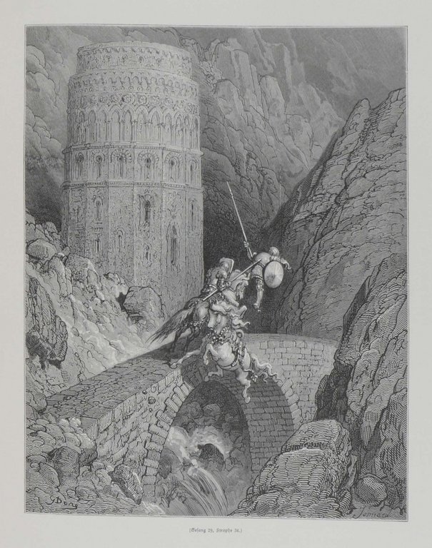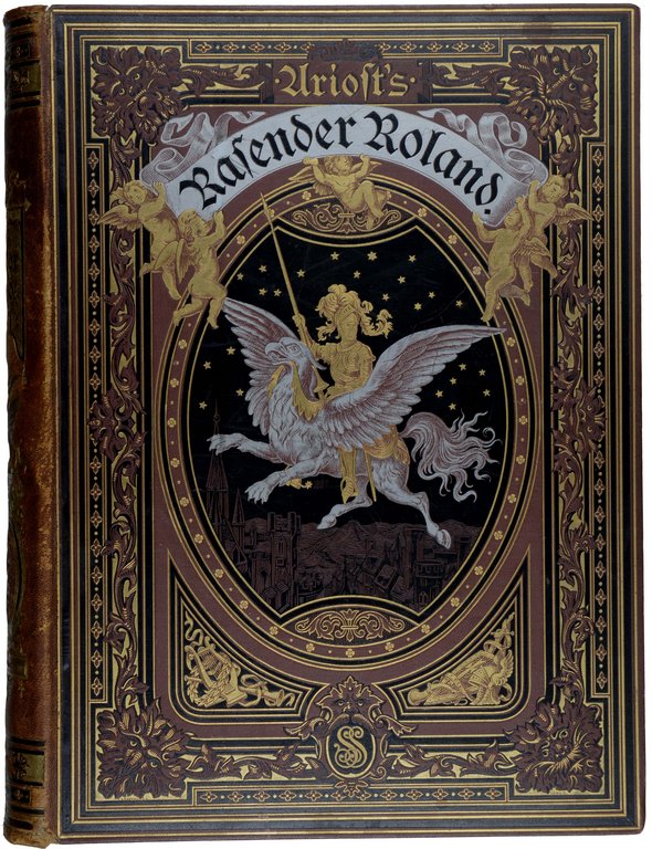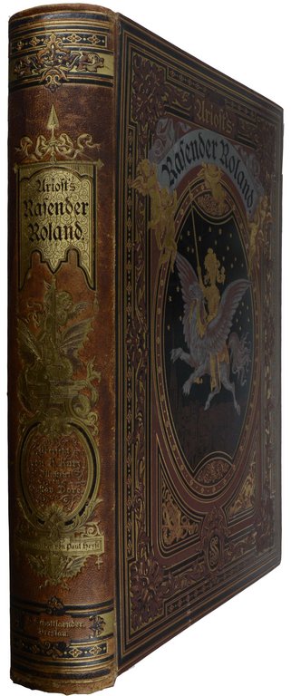 DORÉ - ARIOST, (Ludovico). Rasender Roland. Metrisch übersetzt von Hermann Kurz, durchgesehen und herausgegeben von Paul Heyse. Ausgabe in einem Band. Breslau, S.Schottlaender, o.J. (1880). Folio. 2 nn. Bl., X S., 1 nn. Bl., 636 S., mit zahlreichen Holzstichillustrationen im Text und auf Tafeln von Gustav Doré. Originalhalbleder mit reicher Gold- und Schwarzprägung und Rücken- und Deckelttitel, Kopfgoldschnitt, (leicht beschabt, unteres Kapital etwas gestaucht). € 850,00