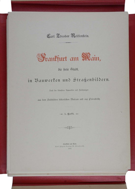 FRANKFURT - REIFFENSTEIN, Carl Theodor. Frankfurt am Main, die freie Stadt in Bauwerken und Straßenbildern. Nach des Künstlers Aquarellen und Zeichnungen aus dem Städtischen historischen Museum und aus Privatbesitz. 6 Hefte (alles Erschienene). Frankfurt am Main, Jügel, 1894-99. Groß-4°. Lose Text- und Tafelblätter, mit 72 (davon 13 montierten farbigen) Tafeln. Illustrierte Originalleinenmappe mit Deckeltitel, (leicht bestoßen, Gelenke etwas eingerissen). € 1.800,00