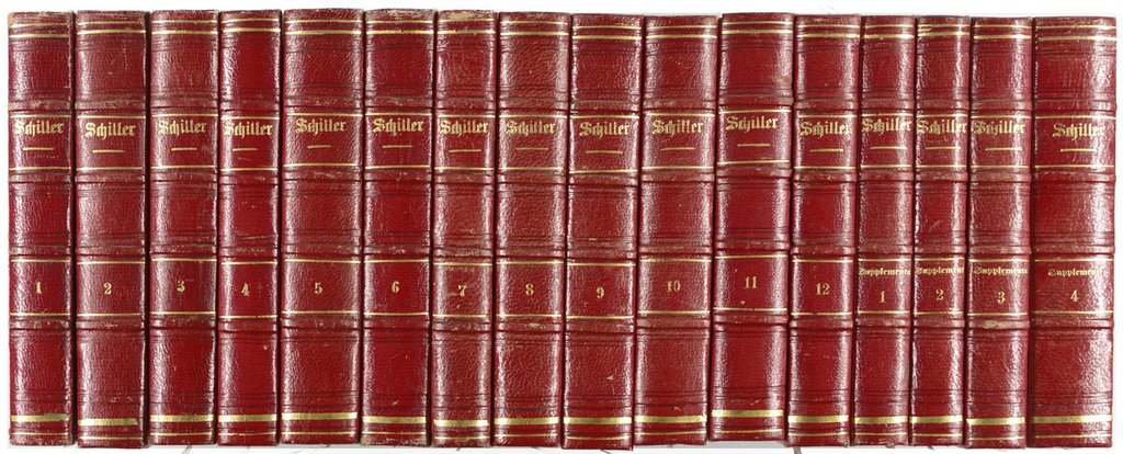 SCHILLER, Friedrich von. Sämmtliche Werke. 12 Bände und 4 Bände Supplemente, in 16 Bänden. Stuttgart, Tübingen und Augsburg, J.G. Cotta, 1853-1858. 8°. Rotes Halbleder der Zeit mit leichter Rückenvergoldung und Rückentitel, (gering beschabt). € 150,00