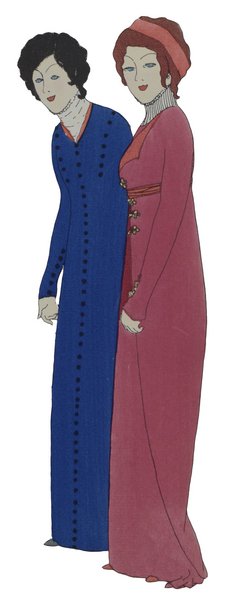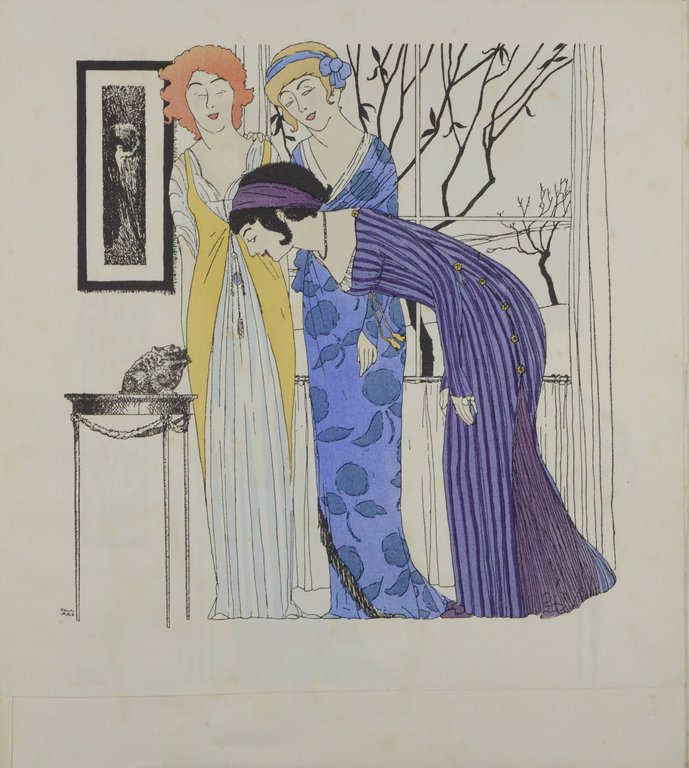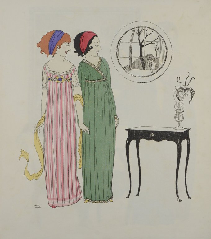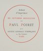 Eins von 250 Exemplaren auf Hollande. - Monod 9208; Colas 1517. - Der Pariser Coutourier und Parfümeur Paul Poiret (1879-1944) gilt als der bekannteste Modeschöpfer in der Zeit bis zum ersten Weltkrieg gilt. Er befreite die Frauen vom Korsett, angeblich erfand er den Laufsteg und zusammen mit dem damals noch relativ unbekannten Zeichner Paul Iribe veröffentlichte er den ersten Modekatalog überhaupt. - Die gemeinsame Arbeit von Paul Iribe (1883-1935) und Paul Poiret verhalf beiden zum Erfolg. Iribe ging später nach Hollywood, von 1931 bis zu seinem frühen Tod war er der Liebhaber von Coco Chanel. - Die wunderbaren, in kräftigen Farben pochoirkolorierten, Figuren präsentieren lockere fließende Kleider, der Hintergrund bleibt dezent in schwarz/weiß. Iribe und Poiret prägten mit ihrem Stil ganz erheblich die Zeit des Art-Déco. - Gering stockfleckig.