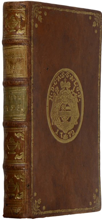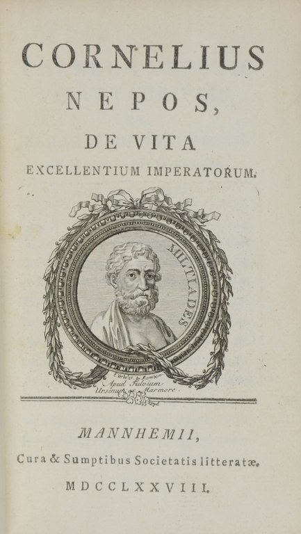 NEPOS, Cornelius. De vita excellentium imperatorum. Mannheim, Cura &Sumptibus Societatis litteratae, 1778. 8°. 315 S., 2 nn. Bl., mit gestochener Titelvignette. Leder der Zeit mit goldgeprägtem Wappensupralibros (datiert 1772), Rücken- und Deckelvergoldung und Rückenschild, (gering beschabt). € 120,00
