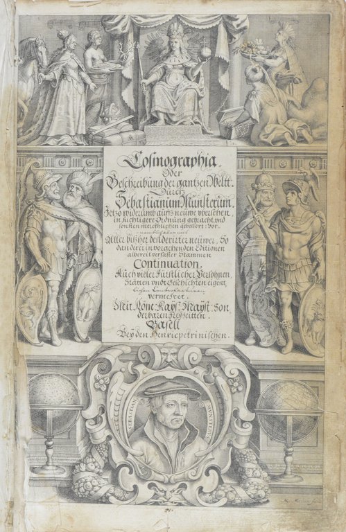 Burmeister 86; VD 17, 23:230709C; Sabin 51396. - Die berühmte Weltbeschreibung in der letzten und umfangreichsten deutschen Ausgabe, gegenüber der voherigen nochmals um 200 Holzschnitte erweitert. - Von den 26 Vortextkarten wurden 25 neu gezeichnet. In unserem Exemplar sind eine (von 2) Weltkarten (es die erste Generalkarte), die Karten von Europa, Asien, Afrika, (Amerika fehlt), 5 (von 6) Karten Deutschlands (es fehlt die 2. Rheinlaufkarte) und die Karten der europäischen Länder vorhanden. - Die Ansichten zeigen Augsburg, Basel, Bern, Bordeaux, Colmar, Eger, Erfurt, Florenz, Frankfurt am Main, Freiburg, Freising, Fulda, Genf, Jerusalem, Kairo Koblenz, Köln, Konstantinopel, Lindau, Meissen, Paris, Simmern, Speyer, Stettin, Straßburg, Rom, Trier, Verona, Worms, Würzburg, Zürich u. a. - Es fehlen die Ansichten von Venedig und die Meerwundertafel. Die große mehrfach gefaltete Ansicht von Heidelberg liegt lose aus einem anderen Exemplar bei. - Gestochenes Frontispiz lose und mit Randläsuren mit etwas Bildverlust, teils stärker braun- bzw. fingerfleckig, Illustration auf Seite 365 und 373 mit geschwärzter Stelle. Die Heidelbergansicht mit kleineren Randeinrissen. Die ersten Blatt mit kleineren Papierausbrühen am Rand. Beiliegend: Amerikakarte in kleinerem Format aus einer früheren Ausgabe.
