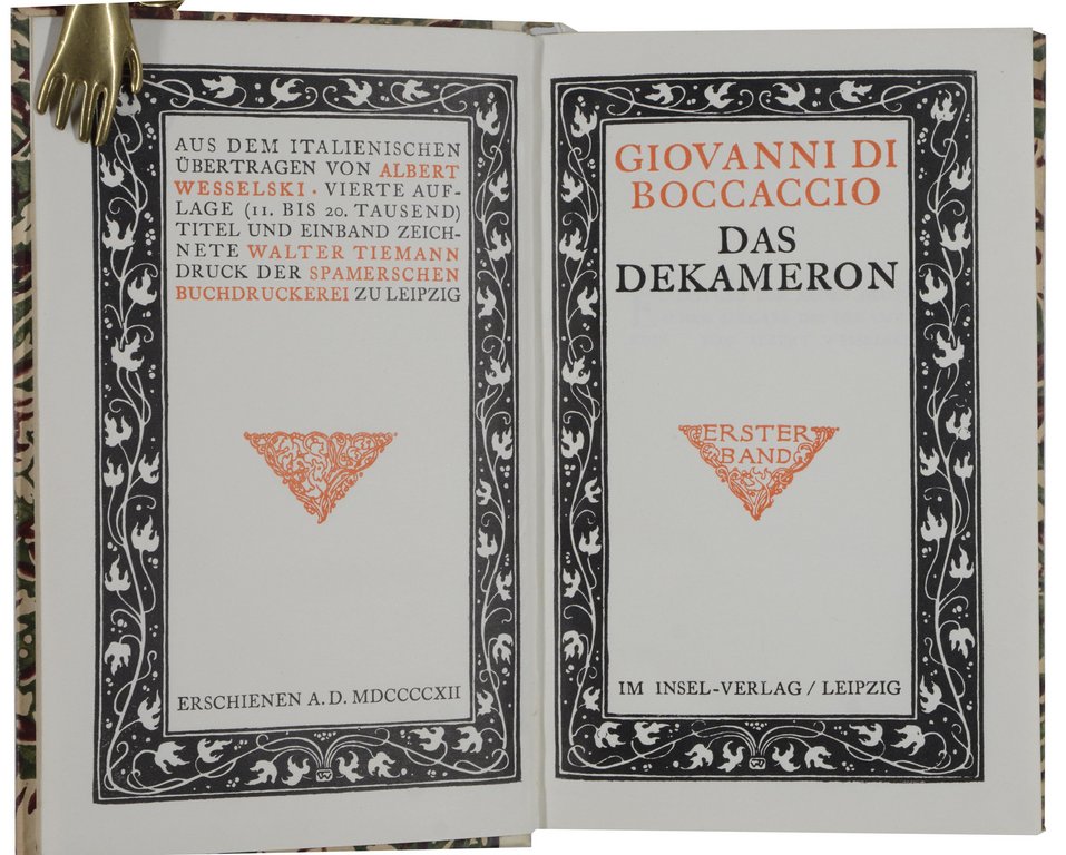 BOCCACCIO, Giovanni di. Das Dekameron. Aus dem Italienischen übertragen von Albert Wesselski. 4. Auflage (11.bis 20. Tausend). 2 Bände. Leipzig, Insel-Verlag, 1912. Klein-8°. XII, 608 S.; 2 nn. Bl., 650 S., 1 nn. Bl. Originalhalbpergament mit reicher Rückenvergoldung und Rückentitel, Kopfgoldschnitt, (minimal unfrisch). € 60,00