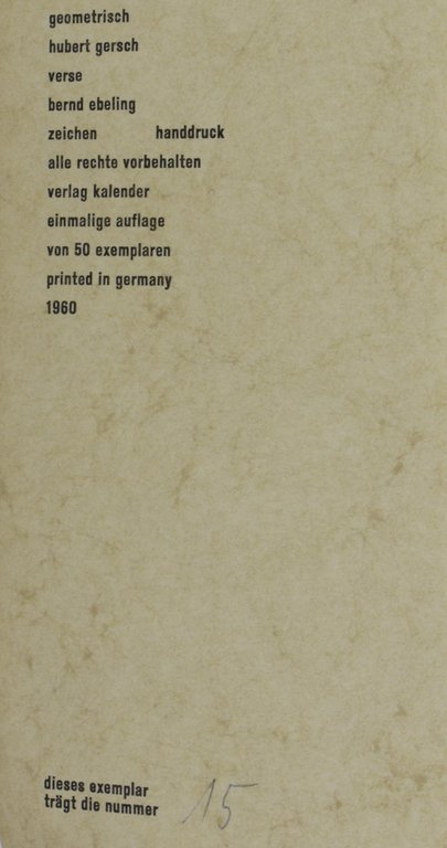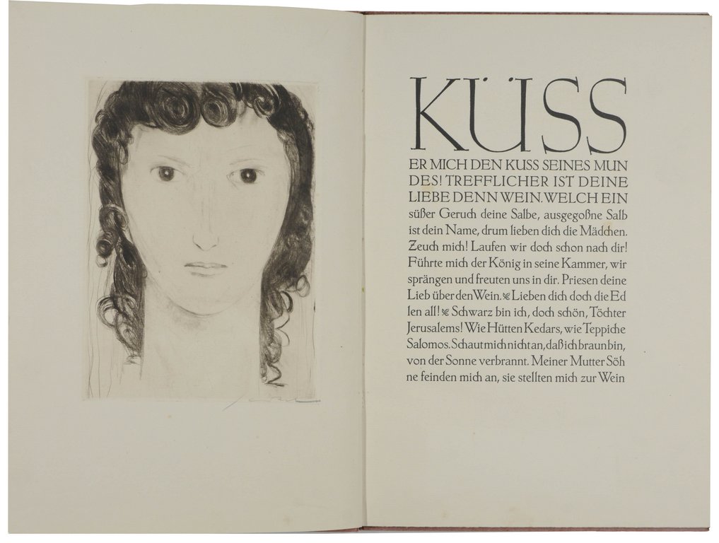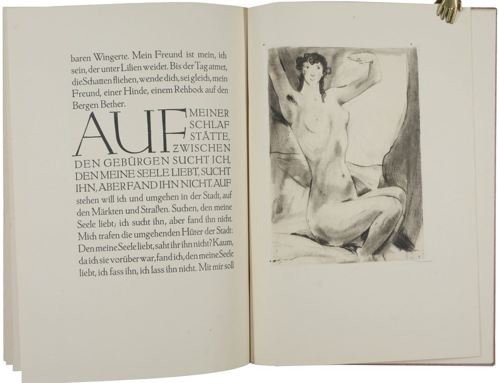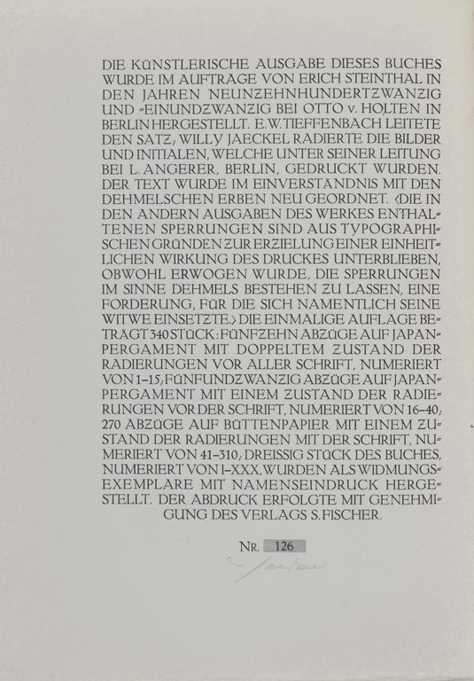 Eins von 370 nummerierten und vom Künstler und Buchgestalter signierten Exemplaren (Nr. 135). - Vierzehnter Ars Librorum Druck. - Druck in der Dante-Antiqua bei Johannes Weisbecker in Frankfurt. Der Handeinband von Helmut Halbach in Königstein. - Sehr schönes frisches Exemplar.