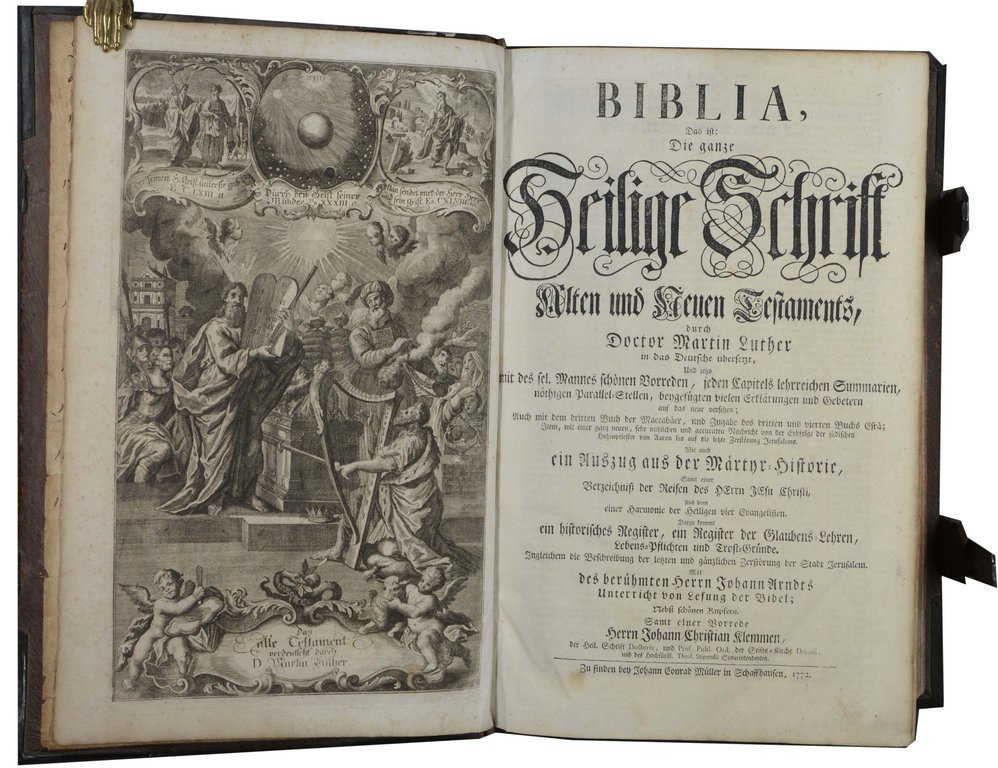 BIBLIA - Biblia, Das ist: Die ganze Heilige Schrift Alten und Neuen Testaments, durch Martin Luther... Wie auch ein Auszug aus der Märtyr-History... Ingleichend es berühmten Herrn Johann Arndts Unterricht... samt einer Vorrede Herrn Johann Christian Klemmen. Schaffhausen, Müller, 1772. Folio. 8 nn. Bl., 940, 263 S., 17 nn. Bl., 52 S., mit 2 Kupfertiteln, 13 Kupfertafeln und 3 gestochenen Karten auf 2 Tafeln. Blindgeprägter dunkelbraun eingefärbter Schweinslederband der Zeit über Holzdeckeln mit 8 Messingeckbeschlägen, 2 Mittelstücken und Schliessen, (minimal beschabt). € 1.300,00