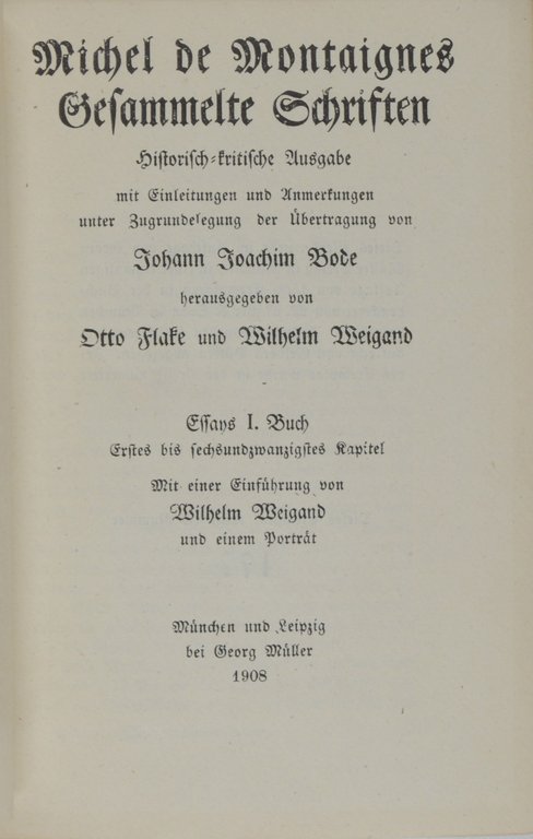 MONTAIGNE, Michel de. Gesammelte Schriften. Historisch-kritische Ausgabe mit Einleitungen und Anmerkungen unter Zugrundelegung der Übertragung von Johann Joachim Bode, herausgegeben von Otto Flake und Wilhelm Weigand. 8 Bände. München, Leipzig, Georg Müller, 1908-1911. 8°. Mit Portrait. Originalhalbleder mit reicher Rückenvergoldung und Rückenschildern, (etwas beschabt, oberes Kapital von Band 1 und 8 leicht eingerissen). € 400,00