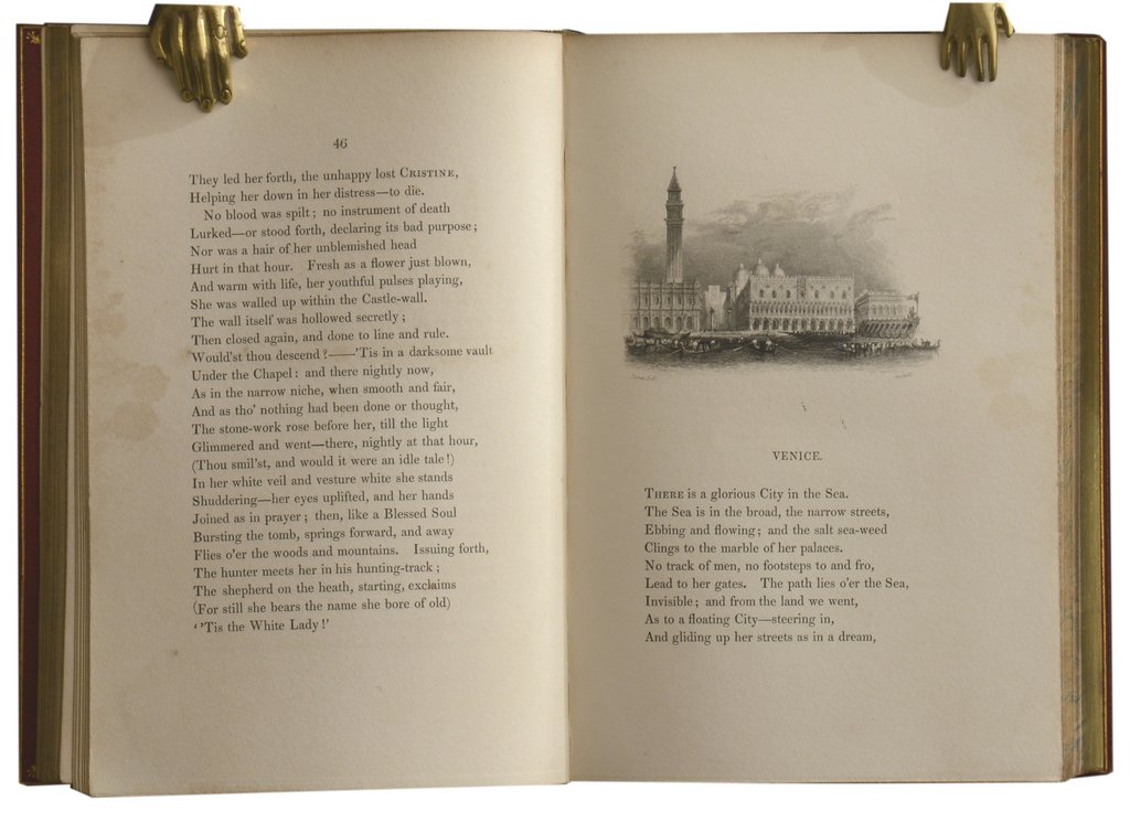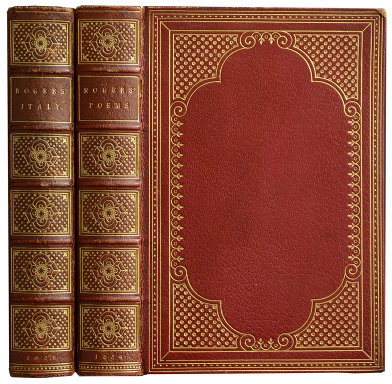 ROGERS, Samuel. Poems. (and) Italy, a poem. 2 Bände. London, Bradbury and Evans for Cadell and Moxon, 1834 und 1846 8°. VIII, 295; VII, 296 S. Mit zahlreichen Stahlstich-Vignetten nach Turner, Prout, Stothard etc. Rotes Maroquin der Zeit mit reicher Rücken- und Deckelvergoldung, Stehkantenvergoldung und doppelten Innenkantenfileten, Goldschnitt, (etwas beschabt, Vordergelenke leicht eingerissen, Ecken etwas bestoßen). € 780,00