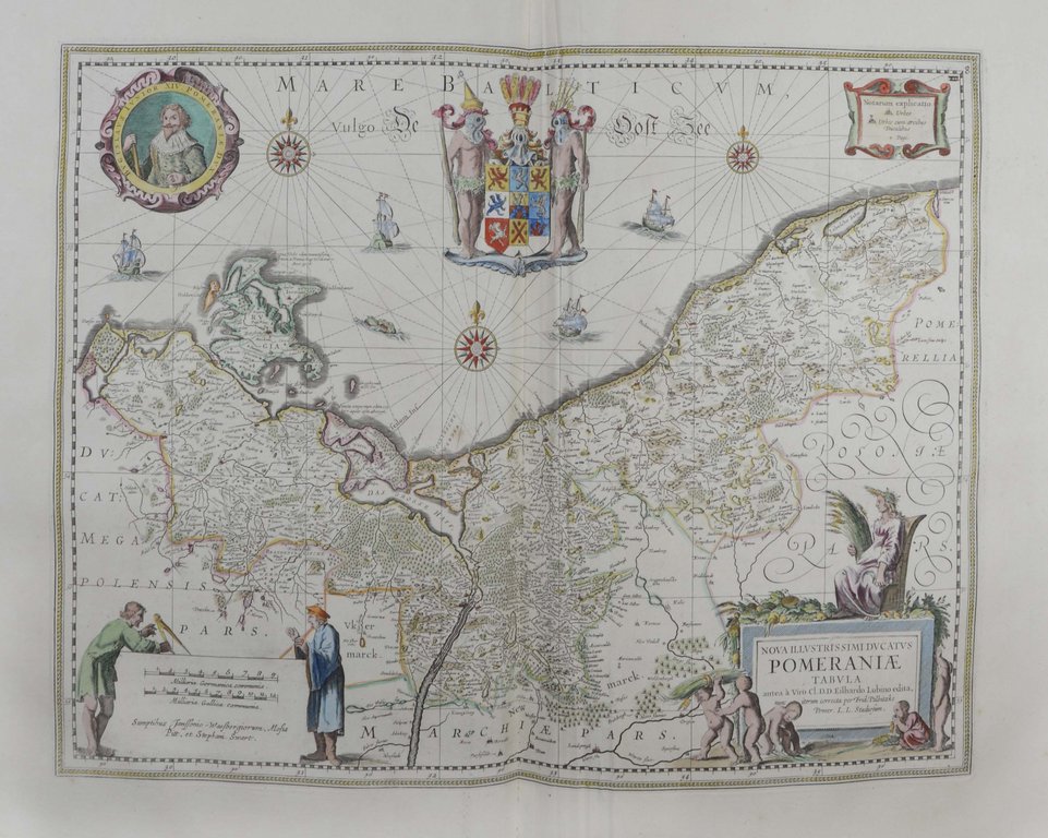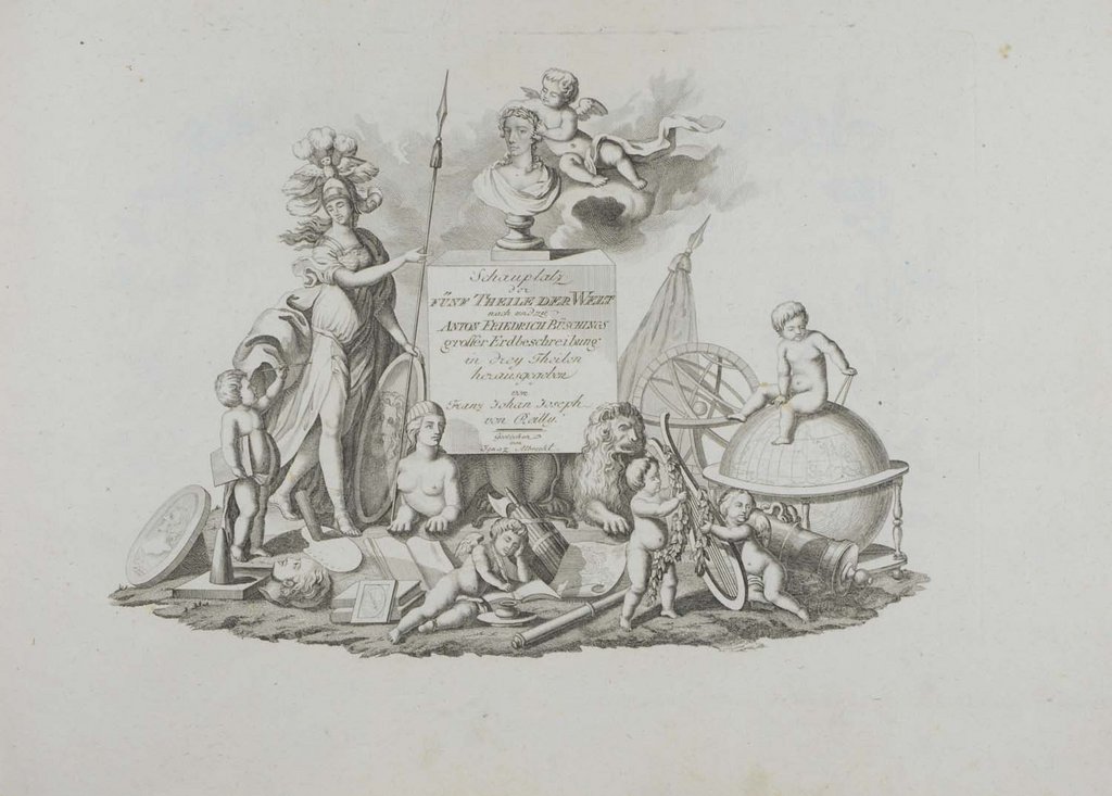 Matthäus Seutter (1678-1757), Schüler von Homann, eröffnete 1707 eine eigene kartographische Anstalt in Augsburg, wo er ab 1728 mit der Anfertigung verschiedener großer Atlanten begann. "Für den Stich sorgte er selbst, für das damals übliche, figurenreiche Beiwerk beschäftige er eine Reihe von Künstlern." (Die Karte als Kunstwerk, 121). Gerahmt.